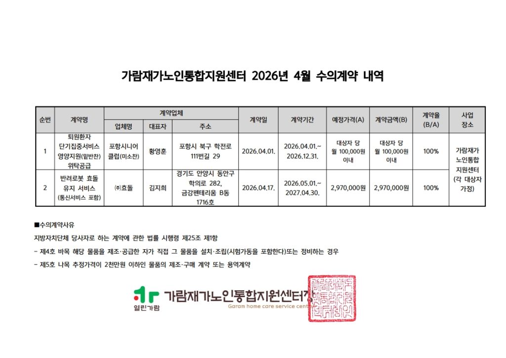 2026년도 가람재가노인통합지원센터 노인맞춤돌봄서비스 ‘퇴원환자 단기집중 서비스’ 사업 추진에 따라 돌봄제공인력을 채용하고자 하오니 유능한 인재의 많은 관심과 응시 바랍니다.