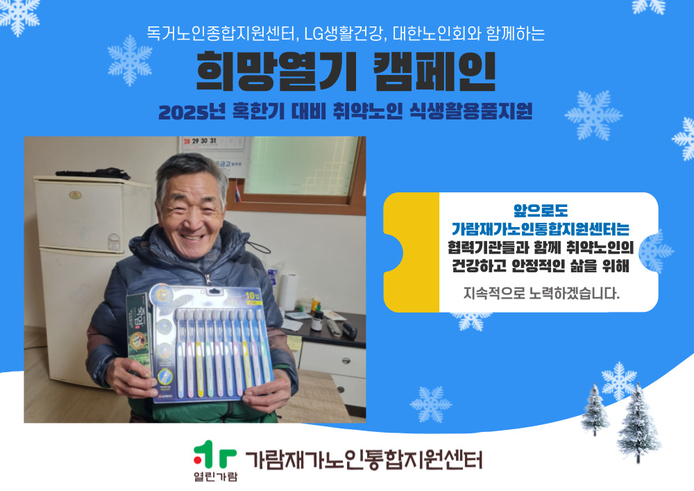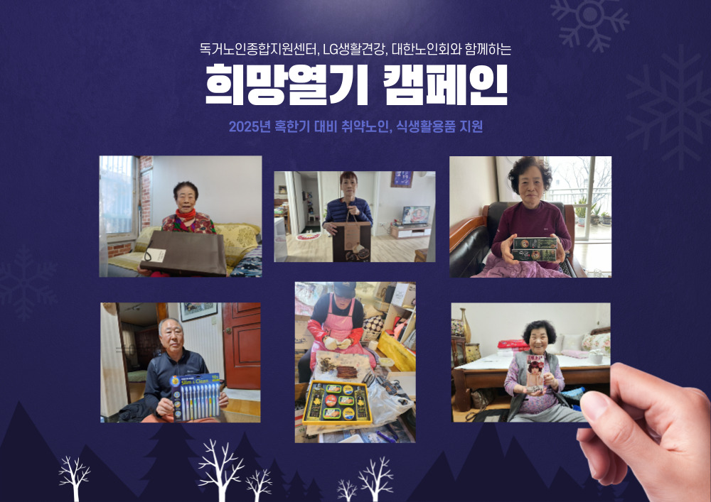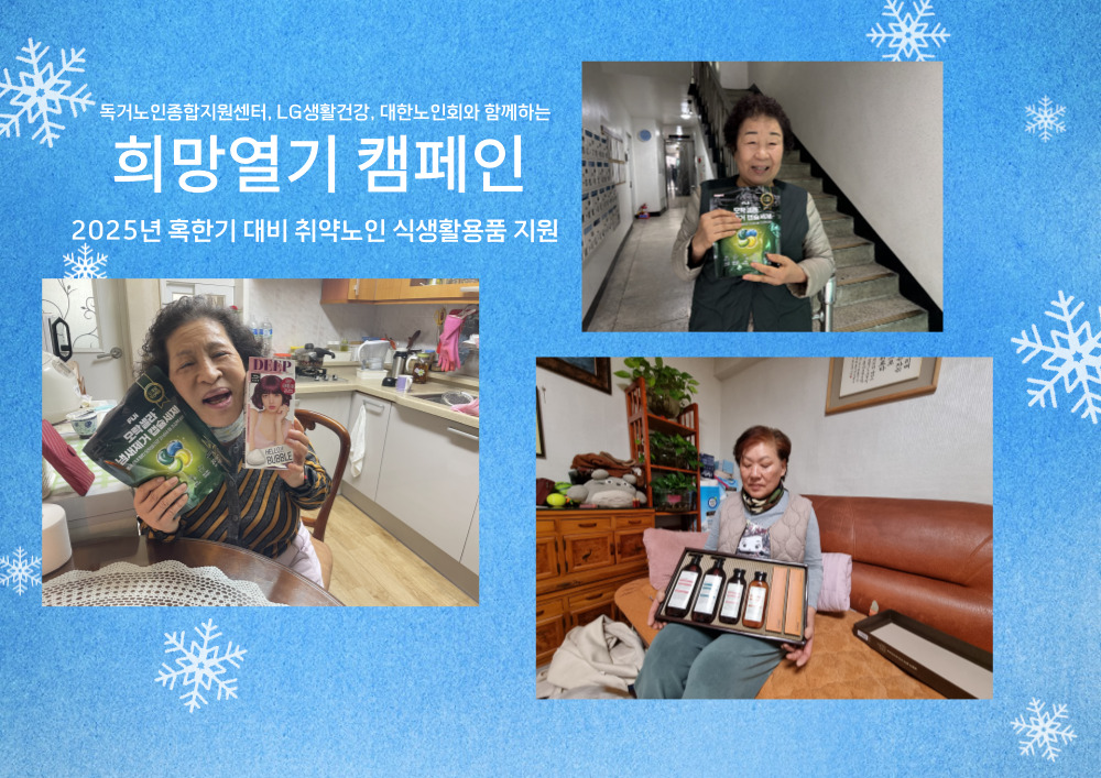 ◉ 내 용 : 독거노인종합지원센터, LG생활건강, 대한노인회와 함께한 「희망열기 캠페인」을 통해 2025년 혹한기 대비 취약노인 식생활용품 및 생활용품을 지원하였습니다.