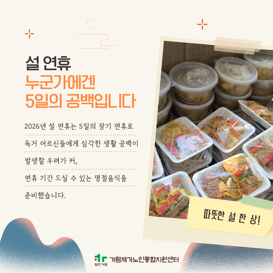 ○ 내 용 : 5일에 걸친 설 연휴 동안 어르신들의 식사 공백이 우려되어, 연휴 기간 중 자원봉사자님들의 도움으로 어르신들께 명절음식을 전달했습니다.