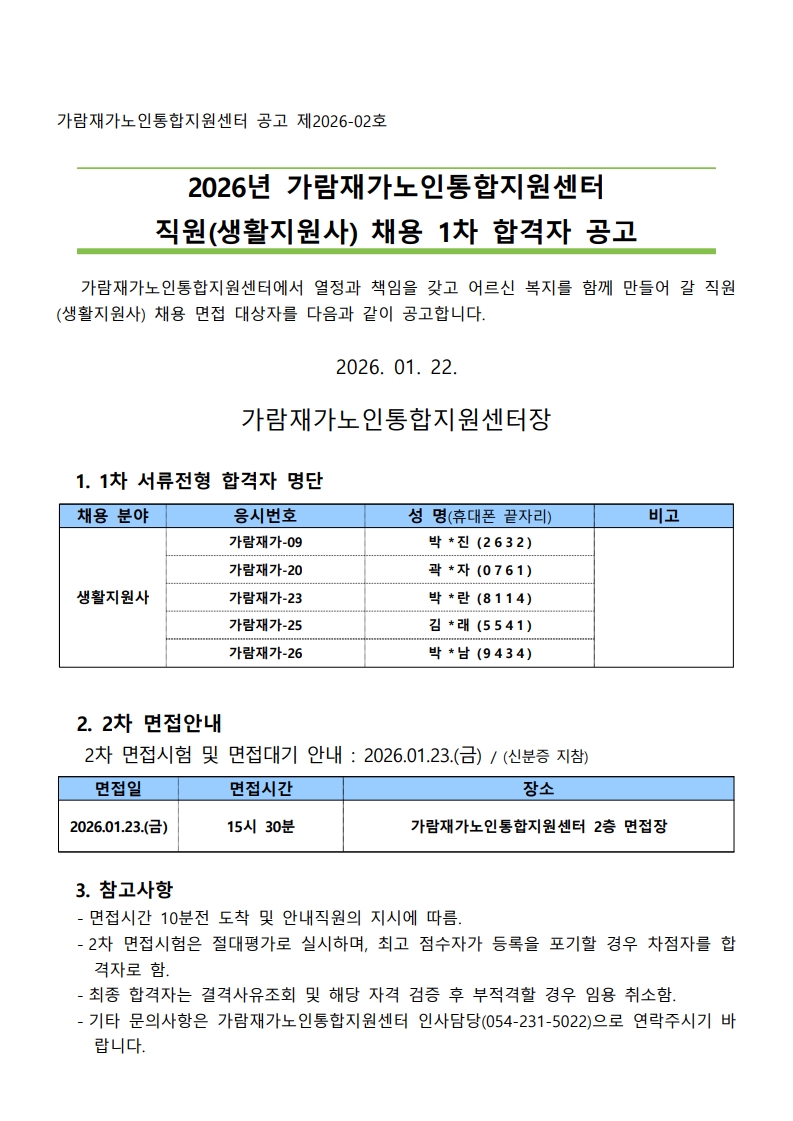 2026년 2차 노인맞춤돌봄서비스사업 생활지원사 채용 1차 합격자 공고